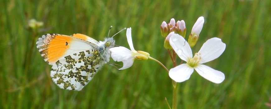 Het oranjetipje is een heel opvallende vlinder, tenminste het mannetje. Die is wit met een flinke feloranje vleugeltip. Het is een onmiskenbaar vlindertje en – toevallig of niet – de soort heeft haar top rond onze oranje evenementen Koninginnedag vroeger (30 april) en koningsdag nu (27 april). Zeker nu het voorjaar van dit jaar 2023 vrij koel is verlopen, klopt het dat de meeste oranjetipjes gemeld zijn tussen 25 april en 4 mei. De vlinders hebben zich eind april voortgeplant. De mannetjes hebben kilometers gevlogen op zoek naar vrouwtjes om mee te paren. De vrouwtjes hebben ook kilometers afgelegd, maar dan om goede plekken te vinden om hun eitjes af te zetten. Ze zijn daar heel kieskeurig in. Het oranjetipje heeft kruisbloemigen als waardplant. De rupsen zijn dus gespecialiseerd en kunnen alleen overleven op kruisbloemigen. Pinksterbloem en look-zonder-look geven de beste overleving van de rupsen, maar ook andere kruisbloemigen kunnen werken. Zo zijn damastbloem en judaspenning, echte tuinplanten, ook waardplant en ook daarop kunnen rupsen overleven.