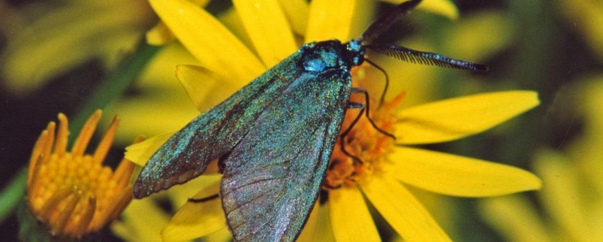 Nature TodayIn het oosten van het land en op de Waddeneilanden kun je in juli de metaalvlinder zien. Deze vlinder is echt metallic groen of blauw gekleurd. Als de zon schijnt, bezoeken ze bloemen, bijvoorbeeld klaver, distels, slangenkruid en jakobskruiskruid. Bij bewolkt weer zijn ze minder actief en zitten ze vaak te rusten op deze planten. Als je geluk hebt kan je er dan eentje van dichtbij bekijken. Zelfs de antennes zijn glimmend! Aan de geveerde antennes zie je ook dat het een nachtvlinder is, maar wel eentje die dus overdag vliegt. Verwarrend, die dagactieve nachtvlinders! Hier lees je er meer over.