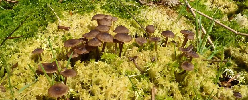 In veenmosvegetaties groeit een aantal kenmerkende paddenstoelen, die vanaf mei tot in de nazomer verschijnen. De meeste kun je zowel in laagveengebieden vinden als in (overblijfselen van) hoogvenen en de oeverzone van vennen op de pleistocene ondergrond. De zomer is een goed moment om op zoek te gaan naar deze paddenstoelen. Eén van de meest voorkomende soorten is de veenmosgrauwkop. Het is een onopvallend, geheel grijsbruin paddenstoeltje dat verspreid of in groepen in het veenmos groeit. Je kunt ze vinden door naar bleke plekken in het veenmos te zoeken. Het hoedje wordt tot drie centimeter in doorsnee, is meestal donkerder in het centrum en aan de rand gestreept. De ranke steel is heel breekbaar en zit deels verborgen in het veenmos. Het meest opvallende kenmerk ontwaar je als je aan de paddenstoel ruikt (aan de onderzijde van de hoed): een sterk ranzige meelgeur. De sporefiguur is wit, een verschil met gelijkende satijnzwammen die in hetzelfde biotoop kunnen voorkomen: zij hebben een bruinroze sporenfiguur.