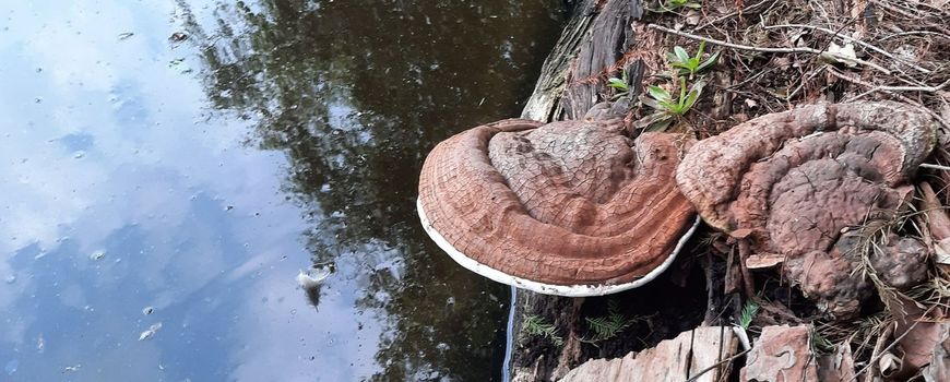 Nederlandse Mycologische VerenigingDe vondst van deze eigenaardige Dikrandtonderzwammen (Ganoderma adspersum) werd gedaan in park De Braak te Amstelveen. De houten beschoeiing van de sloot bestaat hier vreemd genoeg uit oude, dikke, ontschorste stammen. Sommige Dikrandtonderzwammen hingen ternauwernood boven het water. Als er wel weer zware zomerse buien losbreken, zoals we dat tegenwoordig min of meer gewend zijn, dan gaan de Dikrandtonderzwammen kopje onder, wordt gevreesd.