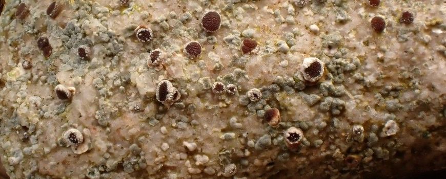 Wie denkt dat alleen de sterschoteltjes kiezels als thuis verkiezen heeft het mis. Er is zelfs een soort die haar naam er aan dankt: kiezeloogje (Leimonis erratica). Deze bedekt vaak bijna het gehele keitje met een grijzige korst met witte verdikte vlekken. De vlekken zijn op hun beurt bezaait met talloze zwarte stipjes. Deze stipjes zijn anders dan de schijfvormige apotheciën van de sterschoteltjes, maar ze hebben met elkaar gemeen dat er sporen in gevormd worden. Deze orgaantjes heten met een lastig woord ‘pycnidiën’. Uit deze sporen kan een kloon van de ouder groeien, terwijl uit een apothecium een geheel, genetisch uniek, individu groeit. Het maakt het makkelijker om te onthouden dat bij het kiezeloogje deze pycnidiën de ‘oogjes’ vormen die je aankijken door de loep. Het verschil tussen beide vruchtlichamen is bij kiezeloogje duidelijk te zien als deze ook apotheciën vormt: dikke zwarte schijfjes tussen talloze kleine oogjes. Er zijn dus genoeg soorten te vinden op zoiets kleins als een kiezel, soms wel meer dan drie soorten op één kleine steen. Dit laat zien dat zelfs een kiezelsteen een gemeenschap aan soorten kan dragen.