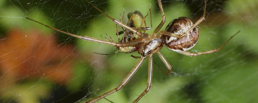 Nature TodayOok al heeft hij een herfstige naam, de herfsthangmatspin geniet misschien toch ook wel van het nazomerweer. Het horizontale net dat deze spinnen weven kan je nu als hangmatjes in hagen en hoog gras zien hangen. De spin zelf is moeilijker te zien: die houdt zich verstopt onder het web. Bovendien zijn ze maar een halve centimeter groot. De prooien gaan natuurlijk niet vanzelf klaarliggen in die hangmat. Maar zo’n twintig centimeter erboven, bijna onzichtbaar, heeft de spin dunne draden gespannen. Insecten die daar tegenaan botsen, vallen naar beneden en landen in het vangnet. De herfsthangmatspin racet aan de onderkant van het web ernaartoe en bijt in de prooi met zijn giftige kaken. In zo’n vangnet kan je beter niet belanden.