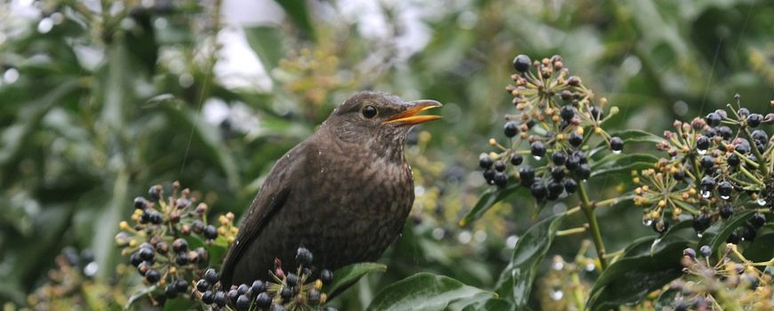 De klimop heeft de fantastische eigenschap te bloeien met geelgroene bloemen wanneer veel andere bloemen ermee stoppen: van september tot december. Als je dus in de buurt zit in het herfstzonnetje, hoor je gelukzalig gegons van de bijen en vlinders die toch nog wat lekkers vonden. De klimop groeit altijd en overal en draagt zijn volle, zwarte bessen vroeg in het voorjaar. Dan zijn de merel, spreeuw en houtduif niet weg te slaan, en de sporadische zwartkop ook niet.