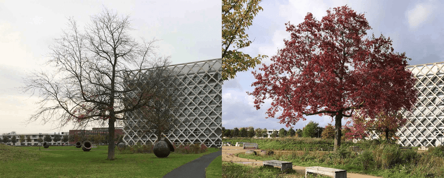 Het eerste voorbeeld hieronder laat twee witte paardenkastanjes zien achter het Gaia-gebouw op de campus van Wageningen University & Research. De bladverkleuring kwam vroeg op gang, maar verliep vervolgens zeer traag, waardoor de bladverkleuring dit jaar het traagst is verlopen van de reeks.