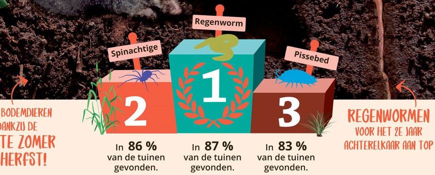 De regenwormen zijn in de meeste tuinen gevonden (87 procent), op de voet gevolgd door de spinnen (86 procent) en de pissebedden (83 procent). Deze volgorde blijkt identiek te zijn aan die van 2022, maar niet van eerdere jaren. Wel zijn alle drie de groepen bodemdieren in een groter deel van de tuinen gezien dan vorig jaar.