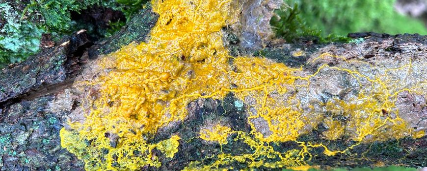 Nature TodayJe komt ze vooral tegen op nat dood hout: slijmzwammen. Slijmzwammen zijn geen echte paddenstoelen en maken een aparte ontwikkeling door. Het begint ergens met een spore. Als meerdere sporen zich samenvoegen dan ontstaat een massieve, meercellige structuur, die het plasmodium wordt genoemd. Dat is de gele smurrie op de foto. Het is een grote, meercellige massa zonder duidelijke celwanden. Deze massa beweegt zich voort door amoeboïde beweging en kan enorme afmetingen aannemen die met het blote oog zichtbaar zijn. Tijdens deze fase beweegt het plasmodium naar voedselbronnen. Op een gegeven moment komt het tot stilstand, zal dan zelf nieuwe sporen vormen en begint alles ergens opnieuw.