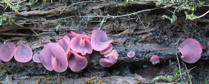 Nederlandse Mycologische VerenigingOp een sterk verrotte stam troffen we mooie Paarse knoopzwammen (Ascocoryne sarcoides) aan die we voorlopig noteerden als: Paarse knoopzwam sensu lato (s.l.). Met de aanduiding 's.l.' (Latijn voor 'in wijde zin') wordt bedoeld dat er meerdere soorten onder deze naam schuil kunnen gaan. Bij een vondst van de Paarse knoopzwam moet er verplicht microscopisch onderzoek gedaan worden, omdat deze soort in het veld niet te onderscheiden is van de Grootsporige paarse knoopzwam (Ascocoryne cylichnium), of er moet 's.l.' achter de naam worden gezet. Er werd daarom een paar exemplaren van de Paarse knoopzwam meegenomen voor onderzoek.