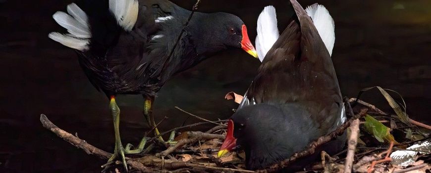 Nature TodayIn de winter zie je vaak meerdere waterhoentjes bij elkaar, op het water of aan de kant op een grasveldje. Dat zijn dan geschikte winterplekken: grotere wateren en sloten. Nu zoeken paartjes weer een eigen plekje op en houden ze zich wat meer verborgen. De broedtijd begint namelijk. Het is tijd om een nest te bouwen aan dichtbegroeide oevers of drijvend op het water. Het nest is een stevige kom van riet of andere planten. Daar legt het vrouwtje vijf tot negen eieren in, ze past er maar net bovenop. En dat is dan nog maar het eerste nest van het jaar, vaak broeden ze tot in augustus nog één of twee keer.