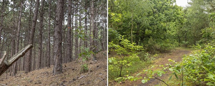 “We halen lang niet alle bomen weg”, vervolgt Marcel. “Op de eerste plaats omdat jonge loofbomen beter opgroeien als ze niet de hele tijd in de volle zon staan, maar ook omdat er ook gewoon dennenbomen mogen blijven staan. Die zijn onderdeel van het gevarieerde Atlantisch duinbos.”