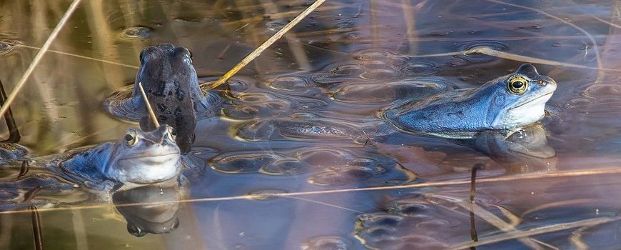 Nature TodayElk jaar is het weer de vraag: wanneer worden de heikikkers blauw? Geloof het of niet, de mannetjes kleuren in de paartijd écht blauw. En dat is dus nu! Het duurt maar een paar dagen tot een dikke week, het is een signaal aan elkaar dat dit hét moment is om te paren. Behalve met hun prachtige kleur laten ze ook van zich horen met een klokkend gekwaak. Op de foto (van vorige week zondag in De Maasduinen) zie je dat het succesvol is geweest, want daar heeft een vrouw al eieren gelegd. Heikikkerdril dus, maar dat ziet er precies hetzelfde uit als ‘gewoon’ kikkerdril van de bruine kikker. Die zitten nu ook in de paartijd, als je kikkerdril ziet kan je dat doorgeven voor de kikkerdriltelling. Zo’n klomp in de vijver of sloot is waarschijnlijk van de bruine kikker, want heikikkers vind je vooral in vennen.