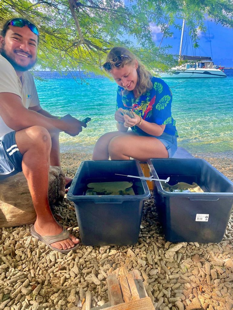 WWF NederlandDe Queen Conch Hatchery in het Curaçao Sea Aquarium levert de jonge gekweekte roze vleugelhoornen voor het onderzoek en heeft faciliteiten beschikbaar gesteld om het transport goed te kunnen voorbereiden. De roze vleugelhoornen zijn na de zeereis eerst geplaatst in een omheining in het zeegrasveld bij Sorobon zodat ze in een veilige omgeving kunnen acclimatiseren. Het was even zorgelijk toen de olievervuiling op Bonaire plaatsvond, maar gelukkig waren er nauwelijks olieresten in de buurt van de omheining. De olievervuiling had geen impact op de jonge roze vleugelhoornen en alle dieren verkeren in goede gezondheid. Na de gewenningsperiode worden de gekweekte roze vleugelhoornen verplaatst naar het wild waar ze vrij kunnen bewegen in de zee. De uitgezette dieren worden vervolgens via zenders gemonitord om te analyseren hoe ze zich gedragen in de natuur en wat hun overlevingskans is.