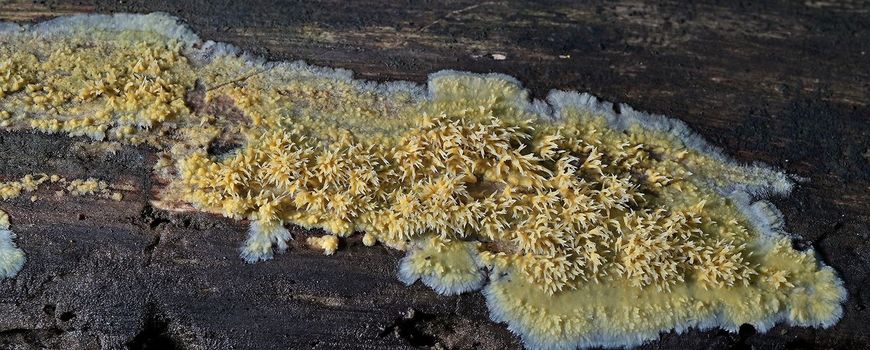 Meegenomen naar huis bleek het om de Gele stekelkorstzwam (Mycoacia uda) te gaan, een soort die helemaal niet zeldzaam is maar blijkbaar altijd door ons werd gemist. Hoe dat komt, is voor ons een raadsel. Zo zie je maar weer dat algemene voorkomende soorten zelfs door gerenommeerde mycologen niet bij voorbaat altijd herkend worden.