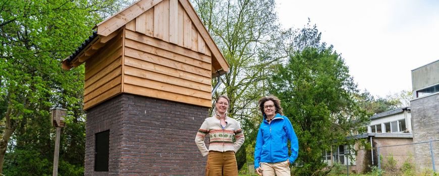 “Onze nieuwste aanwinst is de vleermuistoren met kelder”, vertelt Joke met gepaste trots. “De toren is vijf meter hoog, ongeveer anderhalve meter breed en voorziet in alle verblijfsmogelijkheden die vleermuizen nodig hebben: als winter-, kraam-, zomer- en paarverblijfplaats. De vleermuizen kunnen de toren op verschillende manieren betreden: via openingen achter de houten gevelbetimmering, onder het dak en via stootvoegen. Zowel buiten als in de toren zijn mogelijkheden om te hangen of weg te kruipen. De vleermuizen kunnen zo zelf hun favoriete plek zoeken. Een regenpijp aan de gevel vangt water op dat naar de kelder stroomt. De ruime kelder is een ideale winterverblijfplaats voor bijvoorbeeld de watervleermuis.”