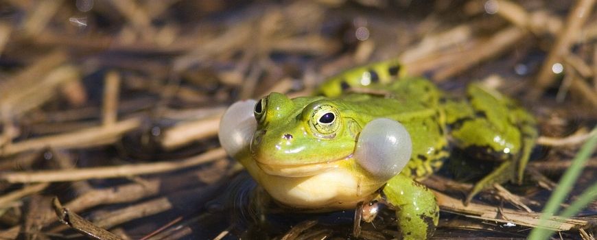 Nature TodayGroene kikkers zitten midden in de paartijd, en dat is te horen! Overal klinkt 's avonds de 'boerennachtegaal'. Er zijn drie soorten groene kikkers: de meerkikker, de poelkikker (op de foto) en de bastaardkikker. Die laatste is een hybride tussen de andere twee soorten. De drie soorten zijn heel lastig uit elkaar te houden. De poelkikker is de kleinste en groenste, de meerkikker de grootste en vaak donkerder groen en met wrattige vlekken. De bastaardkikker lijkt — geen verrassing — op allebei. In de kwaakconcerten kan je wel wat verschil horen, de meerkikker roept met een kwakende lach, de poelkikker met een aanhoudend raspende triller en de bastaardkikker zit er een beetje tussenin. In mei en begin juni worden de eiklompen afgezet, die niet drijven zoals bij die van de bruine kikker.