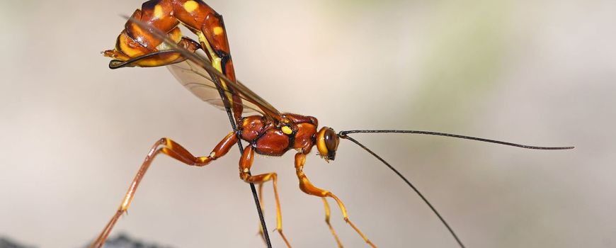 Foto's: Lex Peeters (leadfoto: Een van de vier zeer grote sluipwespen die voorkomt op het Landgoed Wellenseind, Megarhyssa vagatoria)