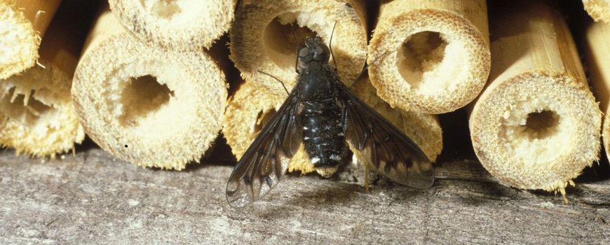 Nature TodayEten en gegeten worden is een van de uitgangspunten van de natuur. Iedere soort heeft zijn eigen natuurlijke vijanden. Als je een bijenhotel maakt, krijg je daar soms van dichtbij mee te maken. Want ondanks al onze goede bedoelingen om solitaire bijen te helpen, is het voor de roofinsecten soms ook een fastfoodrestaurant. Een van de ongenode gasten is de muurrouwzwever, met de onheilspellende Latijnse naam Anthrax anthrax. De muurrouwzwever komt in juni tevoorschijn uit de nesten van vorig jaar, die eigenlijk bevolkt zouden moeten zijn door bijen. Het vrouwtje van de muurrouwzwever houdt namelijk in de gaten in welke gang een bij eitjes legt. Nog voordat die gang wordt afgesloten door de bij, zwiept de vlieg haar onderlijf in de richting van de nestingang en gooit haar eitjes naar binnen. Vermoedelijk – helemaal zeker is het niet – worden de eitjes zelfs wat verzwaard met kleine zandkorrels, zodat ze beter te gooien zijn. De bij sluit later nietsvermoedend de gang af, de larve van de vlieg kruipt op de larve van de bij en eet hem met huid en haar op. Eten en gegeten worden. Overigens is de wetenschappelijke naam niet zo onheilspellend als hij klinkt: anthrax komt van het Griekse woord voor steenkool. Naar het uiterlijk van de muurrouwzwever: zwart als steenkool.