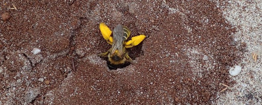 Nature TodayAls je in de buurt van de duinen of een heidegebied bent, kan je daar nu in het zand allerlei kleine zandhoopjes vinden, met in het midden een klein holletje. Dat kan van allerlei bijen of kevers zijn. Ga er eens een tijdje bij zitten en kijk welk beestje daar actief is. Als je geluk hebt zie je bijvoorbeeld hoe een pluimvoetbij een gangetje aan het graven is. Die gaan soms wel een meter de grond in! In zijtakken van de gang zitten enkele broedcellen. Het zijn de vrouwtjes die uitgerust zijn met ‘pluimvoeten,’ een rossige beharing aan de achterpoten. Dat is handig bij het graven van de broedgangen. Zo’n bij kan er ook heel veel stuifmeel in opslaan om het te vervoeren, dan worden de pluimvoeten heldergeel.