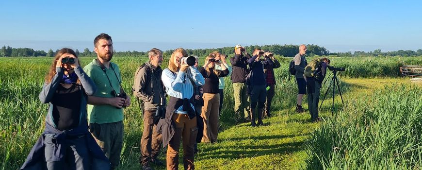 ’s Ochtends vroeg mocht de helft van de groep in de boot het water op. Purperreigers vlogen voorbij en op de steiger lag otterpoep. De rest van de groep mocht wandelend op pad in de Wieden. Twee zeearenden vlogen recht op de wandelaars af en verdwenen in het natuurgebied. De otters lieten zich niet zien. Misschien hadden de otters de wandelaars wel gespot? Daarna nam voormalig boswachter Jeroen Bredenbeek de hele groep mee op pad in de Weerribben. Bijna iedereen ging op de knieën om de bekende geur van otterpoep goed in zich op te nemen.