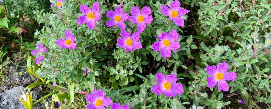 Dat zal prettig geroken hebben. Het gebruik als tuinplant is van recente datum, maar Cistus is al sinds oude tijden leverancier van labdanum (ook wel geschreven als ladanum, ladan of ladanon). Bruine, kleverige hars die gewonnen wordt uit Cistus ladanifer en Cistus creticus. De Griekse historicus Herodotus schreef dat labdanum verzameld wordt uit boksbaarden, waaraan de hars blijft hangen als de bokken van de Cistus eten. Recenter wordt het verzameld door wol door de stuiken te trekken en er zijn speciale gereedschappen, een soort bezems met stroken dun leer in plaats van borstelharen, om de hars te verzamelen. In vroegere tijden werd labdanum gebruikt in de geneeskunde, het heeft een rol in parfums en sterke drank — Google maar eens een rondje, je komt allerlei producten met labdanum/cistus tegen.