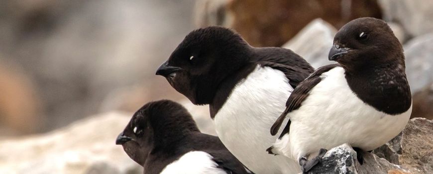 Beeld: Joep de Leeuw (leadfoto: Kleine alken met voedsel voor de jongen in de krop. Ze voeren hun jongen in holen onder de stenen)