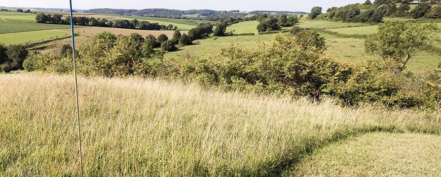 Vanaf een hoog punt van de Wrakelbergse-helling tuurt Guido in de verte. Hij wijst op het verschil in hellingen. “Als je die landbouwgebieden vergelijkt met de natuurlijke graslanden valt meteen het verschil direct op. Op de flauwe hellingen met akkers zijn veel landschapselementen verdwenen, terwijl de natuurgebieden veel ruwer zijn. Het gevolg daarvan merken we tijdens de extreme regenbuien die zich steeds vaker voordoen. De stroompjes regenwater vormen samen met de losse bodemdeeltjes modderstromen die op deze akkers nergens tegenstand vinden. Ze stromen zo snel het dal in. Juist het kalkgrasland met zijn graften is goed in staat stromend water af te remmen en als een spons in zich op te nemen.”