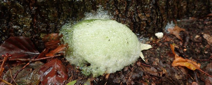Een heel ander soort schuim dat je nu ook kan tegenkomen is groot kalkschuim. Deze slijmzwam is melkwit en heeft de vorm van een kussen. In Nederland komt hij vrij algemeen voor en groeit meestal tussen vochtig gras. De buitenkant bestaat uit een dunne, brosse schaal, die is opgebouwd uit kalkkristallen. De slijmzwam brengt het grootste deel van zijn leven door als microscopisch kleine, eencellige organismen in de bodem. Wanneer de omstandigheden echter goed zijn, klonteren ze samen en bewegen ze zich boven de grond om een groter organisme te vormen, een plasmodium genaamd. Na een paar dagen wordt het plasmodium droog en schilferig en valt het uit elkaar. De zwarte sporen komen vrij en produceren de volgende generatie slijmzwammen.