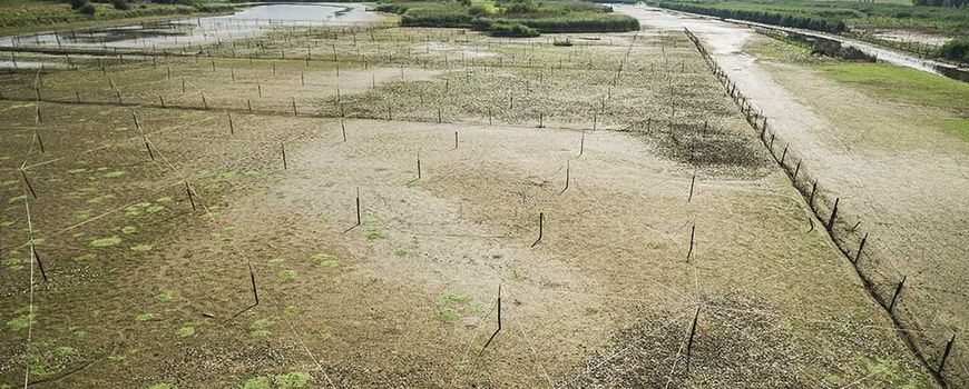 Afgelopen maanden was weer zo’n vierjaarlijkse droogval ingepland. “Het waterpeil werd tijdelijk lager ingesteld. Helaas zorgde de grote hoeveelheid regen ervoor dat de bodem niet helemaal is drooggevallen. Wel was het ondiep genoeg voor ons om weer nieuwe delen riet aan te planten.” Theo laat een deel water zien waar hier en daar een rietpol groeit. Het is overspannen met witte linten. “Dit riet hebben we enkele weken geleden hier geplant. Een pol riet per twintig vierkante meter. Riet breidt zich eerst uit in de breedte voordat het omhoog groeit. Binnen een paar jaar staat het hier helemaal vol. De witte linten zijn bedoeld om de watervogels hier tijdelijk weg te houden. Ganzen, zwanen en meerkoeten houden erg van de jonge rietscheuten. Op eerder aangeplante delen hebben we ervaren dat ze alles wegvraten, dat voorkomen we nu op deze manier.”