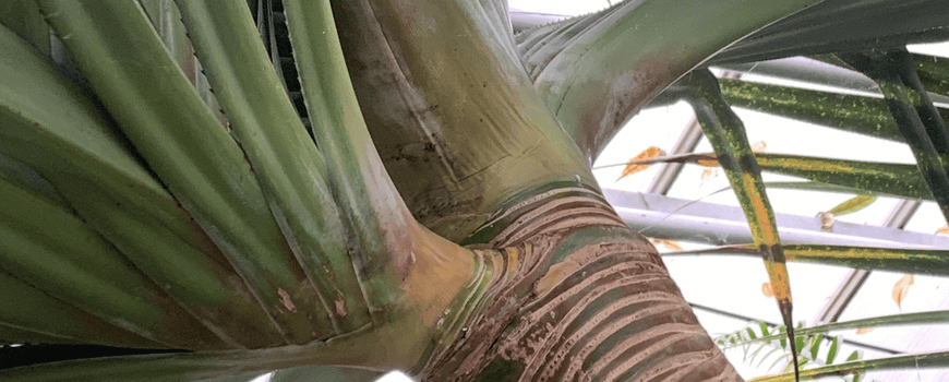 De schroefpalm heeft mannelijke en vrouwelijke planten. Het was niet bekend van welk geslacht de schroefpalm in de Hortus was. Tot vorig jaar. Onze schroefpalm stond onverwachts in 2023 in bloei en kreeg indrukwekkende, geurende bloemtrossen vol meeldraden (zie afbeelding rechtsonder). Hieruit kon worden afgeleid dat het een mannelijk exemplaar is.