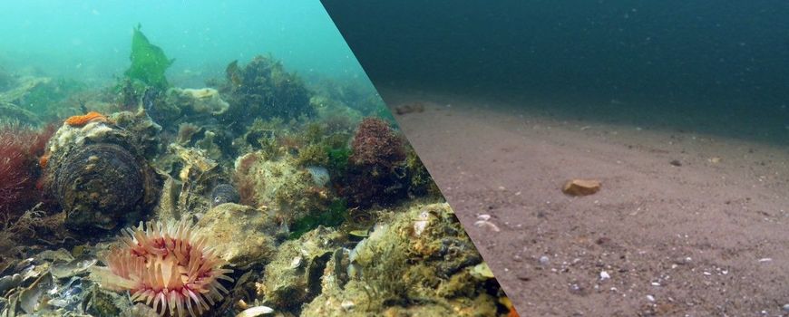 Beeld: Floor Driessen, Waardenburg Ecology (leadfoto links: riffen groeien bij voldoende rust op de bodem); Peter van Rodijnen, Dutch Maritime Productions (leadfoto rechts: de door sleepnetvisserij aangetaste zeebodem); NASA