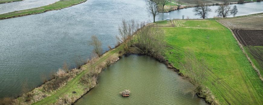 Foto's: Maikel Samuels voor Waterschap Aa en Maas (leadfoto: dronefoto van de drijvende hoogwatervluchtplaats)