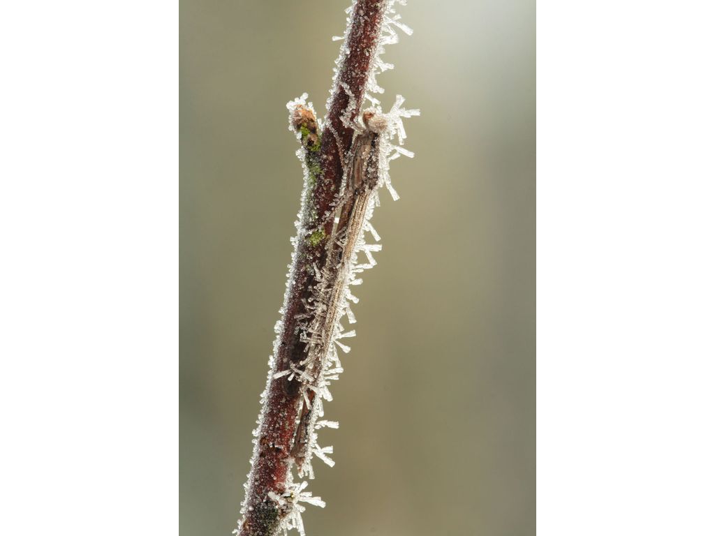 De bruine winterjuffer is een van de weinige libellen die als volwassen libel overwintert. Bijna alle andere libellen overwinteren onder water: als eitje of als larve. Samen met de noordse winterjuffer is de bruine winterjuffer de enige Nederlandse libellensoort die het anders aanpakt. Zoals de naam al zegt is deze waterjuffer bruin. Dat is handig, want hangend tussen de uitgebloeide stengels valt hij dan nauwelijks op. Voor een beetje kou is de bruine winterjuffer niet bang: dankzij de antivries in hun lijf kan ze niets gebeuren. Zo’n berijpt diertje is een spectaculair gezicht!