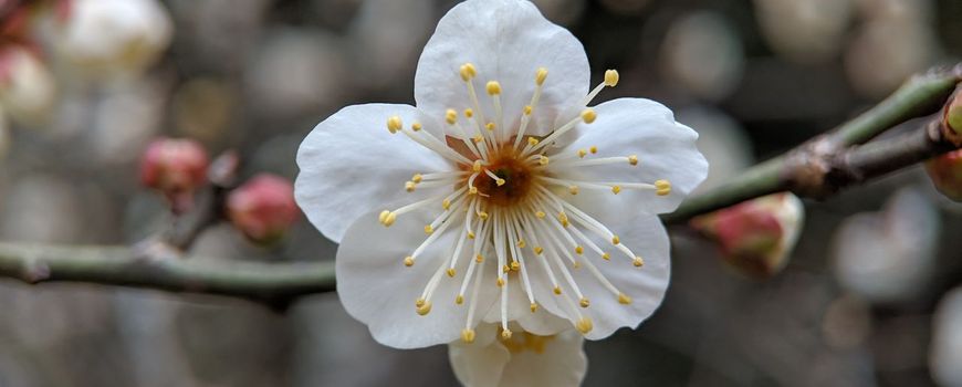 De zwakgeurende bloemen variëren in kleur van wit tot rozerood en hebben een diameter van twee tot tweeënhalve centimeter. Het is de geur van deze bloemen waar de Japanse dichter Sugawara no Michinzane over schrijft in het gedicht op de muur in de Hortus. In Japan is de Ume een zeer gewaardeerde bloesemboom. De Japanners hebben dan ook veel cultivars ontwikkeld. Een bekende cultivar is de laatbloeiende Beni-chi-dori, met rode, geurende bloemen.