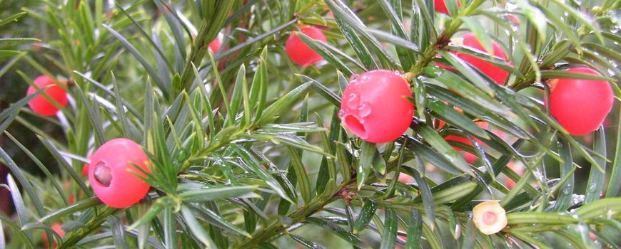 Voor dit artikel gingen we op 15 februari even foto’s maken van taxusexemplaren in de Hortus Haren. Er lag nog steeds wat sneeuw. Dat kwam mooi uit voor de contrasten. In de botanische tuin in Haren zijn verschillende exemplaren te vinden: als losse hagen aan de randen van de tuin en ook onderdeel van de Nationale Plantencollectie in de Laarmantuin. Sommige exemplaren zijn fors uitgegroeid in de breedte, Taxus baccata ‘Dovastonii Aurea’ bijvoorbeeld. Andere zijn zuilvormig en blijven relatief smal. Een voorbeeld is Taxus baccata ‘Fastigiata Aureomarginata’. Nadeel van de zuilvormige exemplaren is dat ze in geval van hevige sneeuw en daarna beperkte dooi, topzwaar worden door de sneeuwlading die in ijs verandert. De taken buigen diep uit naar buiten, breken soms af onder het gewicht en komen na de dooi niet altijd meer vanzelf omhoog. Let maar eens op als je een grote zuilvormige taxus in een voortuin ziet. Na een winter met sneeuw zie je vaak takken die met waslijnen of andere draad weer in de zuilvorm teruggedrongen worden.