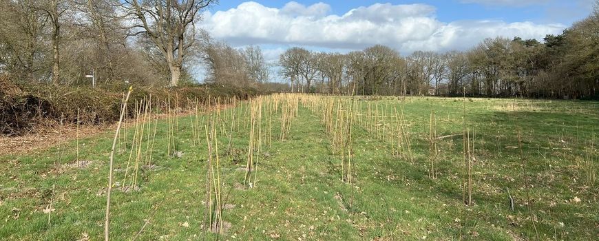 “We hebben ook van Harm geleerd dat we bij de jonge aanplant vanuit Climate Forest clusters van bomen moeten maken. Dan zet je bijvoorbeeld vijftien lindebomen bij elkaar en er vijf kersen omheen. De jonge bomen groeien zo in groepjes. Om de boompjes te beschermen tegen de reeën, die tussen het Mastbos en het Strijbeekse bos door ons gebied trekken, hebben we er bamboestokken omheen geplaatst. Volgens mij werkt het, want we zien nog geen vraat of schuurplekken. De aanplant doet het sowieso goed. We hebben het in november en december in twee weekenden geplant en nu, begin april, staat alles al in de knop. Linde, zoete kers, meidoorn, haagbeuk, hazelaar… we hebben negen verschillende soorten geplant. We zijn er nog lang niet en we zijn nog steeds lerende, maar we vinden het ontzettend leuk om zo samen meer natuur te maken.”