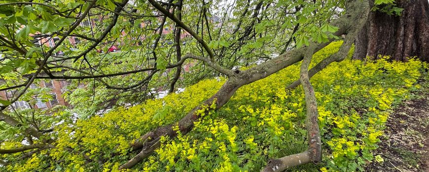 Hortus botanicus LeidenDoorwaskervel (Smyrnium perfoliatum) is tweejarig: het eerste jaar vormt de plant blad, het tweede jaar bloeit hij. Daar is op het plakkaat onder de kastanje weinig van te zien door de zee aan bloemen. De bloei startte begin april en houdt wekenlang aan. Als de plant op minder beschaduwde plekken staat, gemakkelijk tot eind mei. In de zon doet doorwaskervel het ook prima.