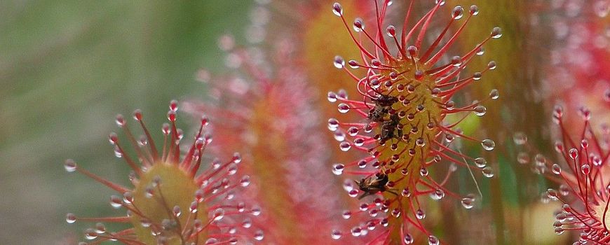 Nature TodayOok in Nederland komen vleesetende planten voor. Geen grote levensgevaarlijke reuzen, maar klein en subtiel. Toch is het voor allerlei insecten oppassen geblazen, want de kleine zonnedauw vangt met gemak een waterjuffer. Deze plant groeit niet zomaar overal en is dan ook zeldzaam. Je vindt kleine zonnedauw op plekken die in de zomer droog, maar in de winter onder water staan. Kleine zonnedauw is te herkennen aan de roodgekleurde bladeren die in rozetten staan. Aan de bladeren zitten haren met taaie, plakkerige druppels eraan. Insecten blijven daar gemakkelijk aan kleven en hoe meer ze bewegen, hoe vaster ze komen te zitten. Dankzij de enzymen in de druppels wordt de gevangen prooi langzaam verteerd. Dankzij het ‘eten’ van insecten kunnen de planten hun dieet aanvullen met stoffen die ze niet uit de mineraalarme bodem kunnen halen.