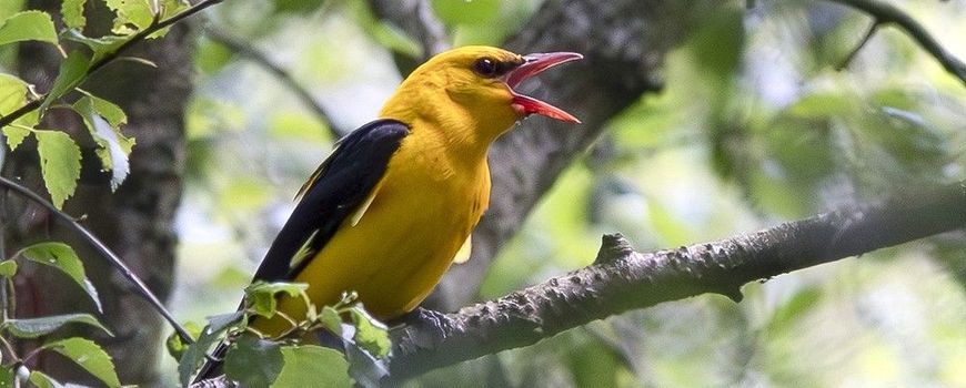Nature TodayJonge wielewalen hebben het nest verlaten en worden nu door hun ouders en oudere broers en zussen gevoerd. Ze zijn nog niet zo helder gekleurd als hun ouders en bedelen om eten. Op het menu van de wielewaal staan voornamelijk grote rupsen, kevers, sprinkhanen en vlinders. Die zoeken ze niet op de grond, maar in de kruinen van bomen. Daarom zie je de vogels niet vaak. Hun opvallende gele en zwarte veren zorgen ervoor dat ze slecht te zien zijn met tegenlicht – en dat is precies wat er gebeurt wanneer je omhoogkijkt.