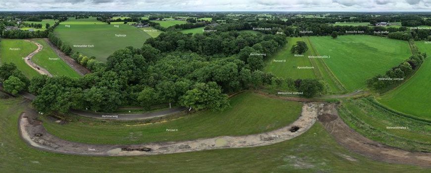 Dit najaar wordt het project op landgoed Weleveld afgerond met de aanplant van nieuw bos en het realiseren van diverse landschapselementen. Daarbij is bewust gekozen voor plekken waar natuurontwikkeling en landschapsversterking samenkomen. Aan de zuidzijde van de Bornsche beek worden groene zomen verbreed en rond de nieuw aan te leggen slenk komt extra bos. De lage ligging van de twee percelen waardoor de slenk loopt is een kansrijke plek voor een nieuw type bos dat de biodiversiteit versterkt.