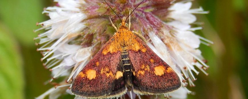 Nature TodayHet muntvlindertje is een dagactieve nachtvlinder die, ondanks zijn relatief grote formaat, behoort tot de zogenoemde microvlinders. Hij komt veel voor in tuinen, maar ook in parken en langs sloten, verspreid door het hele land. Je kan hem herkennen aan de bordeauxrode vleugels met gele vlekken. Hij lijkt op het zeldzamere purpermotje, maar deze heeft een iets ander vleugelpatroon, namelijk met een duidelijke, snorvormige vlek op de bovenvleugels. Het muntvlindertje komt voor in twee generaties, welke op elkaar aansluiten: een in het voorjaar en een in de zomer. Waardplanten van het muntvlindertje zijn muntsoorten, maar ook enkele andere aromatische soorten uit de lipbloemenfamilie.