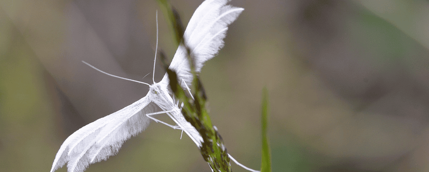 Is het een vogel, is het een vliegtuig? Je kijkt vreemd op als je een sneeuwwitte vedermot tegenkomt. Dat kan zomaar binnenshuis zijn, waar licht lokt. Vedermotten zijn een familie van microvlinders (Pterophoridae). Ze hebben lange poten met uitsteeksels – sporen – en draadvormige antennen zonder knopje aan het uiteinde. De smalle vleugels van de sneeuwwitte vedermot bestaan uit geveerde pluimen. De voorvleugels hebben er twee, de achtervleugels drie. In rust schuiven sneeuwwitte vedermotten hun vleugels onder elkaar, zodat een T-figuur ontstaat. Niet verwonderlijk misschien dat dit geen langeafstandsvliegers zijn, daar zijn hun vleugels niet op gebouwd. De rupsen foerageren onder andere op akkerwinde.