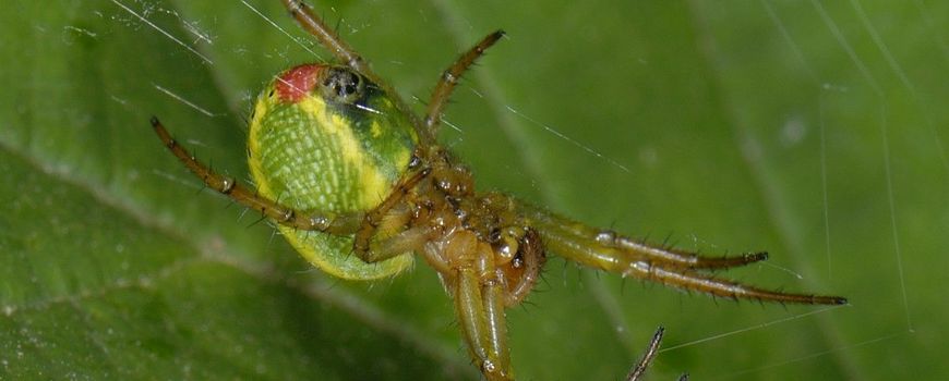 Nature TodayDe gewone komkommerspin is een zeer algemene spinnensoort in ons land, die ook dikwijls wordt verward met de sterk gelijkende tweelingkomkommerspin. Vooral in het voorjaar en de zomer is de frisse komkommergroene kleur van hun achterlijf te zien. In het najaar kleuren ze mee met de vegetatie, zodat ze minder opvallen. De volwassen dieren hebben een rode vlek aan de buikzijde, bij de plek waar de spinklieren zitten. Bij vrouwtjes is daar een stukje boven – vlak onder de aanhechting van het derde pootpaar – de epigyne of geslachtsopening te zien als een donker, waaiervormig vlekje. Mannetjes, die iets kleiner blijven, hebben die niet. Zij gebruiken een deel van hun pedipalpen (twee tasters bij de monddelen) bij de overdracht van hun zaad. De gewone komkommerspin is een wielwebspin – en dat is natuurlijk goed te zien aan de vorm van het web dat ze spint.
