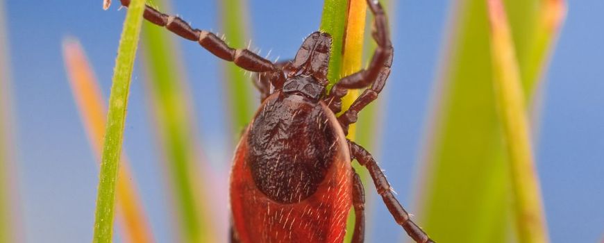 Nature TodayTegen de tijd dat je een schapenteek doorhebt, zit hij al volgezogen in de vacht van je huisdier – of op jezelf. Een vrouwtje met een lege maag is zo’n twee millimeter groot, maar kan eenmaal volgezogen meer dan een centimeter groot zijn. De kleine kop heeft twee korte voelsprieten, daartussen zit de steeksnuit die ongemerkt ellende aanricht. Schapenteken klimmen in grassprieten en bladeren en wachten op een gastheer. Dat kan een zoogdier, vogel of reptiel zijn. Het is nogal vervelend dat een schapenteek in zijn leven drie gastheren verslijt en het niet zo nauw neemt met zijn menukeuze. Zo bestaat de kans dat hij een muis of vogel uitkiest die besmet is met de Borrelia-bacterie, de veroorzaker van de ziekte van Lyme. Zo raakt de teek zelf besmet en geeft deze het, als het niet zijn laatste maaltijd was, door aan een volgende gastheer.