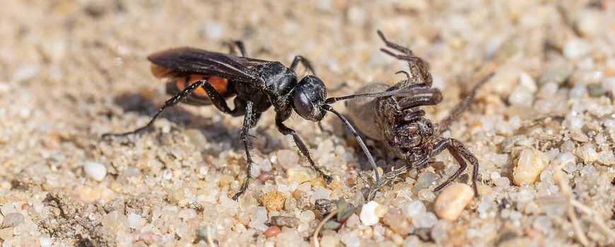Nature TodayDe roodzwarte borstelspinnendoder is een wespensoort uit de familie van de spinnendoders en wordt ook wel gewone wegwesp genoemd. Het leventje van spinnendoders zit vol spannende actie: zespotige insecten die strijden met achtpotige spinnen – beide gewapend met gif. De gewone wegwesp weet precies hoe ze een spin moet benaderen, zonder zelf te worden gebeten en verlamd te raken. Doelgericht prikt ze spinnen – waaronder wolfspinnen – in het borststuk tussen de aanhechtingen van de poten. Ze verbergt de verlamde spin zolang in de vegetatie, graaft een tunneltje in het zand, haalt haar buit op en sleept die er achterwaarts lopend in. Voor ze de boel afsluit met zand, legt ze een eitje op de nog levende spin. Als haar larve uitkomt, kan die meteen beginnen met eten.