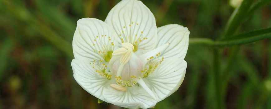 Nature TodayIn een aantal natuurgebieden staat parnassia nu in bloei met opvallend geaderde, roomwitte bloemen. Parnassia is vrij zeldzaam in de duinstreek en komt verder hier en daar voor in nattere, voedselarme en wat kalkrijkere natuurgebieden. Parnassia lokt insecten met de vijf meeldraden met bolletjes, die tussen de vijf functionele meeldraden in staan. De glanzende, goudgele knopjes beloven nectar, maar dat is valse reclame waar insecten intuinen. Toch is er wel nectar voor ze te vinden aan de voet van elk van die nepmeeldraden, ook wel honingtoestellen genoemd. De functionele meeldraden die hun stuifmeel nog niet hebben afgegeven, zijn naar het midden gebogen. Op bovenstaande foto zijn dat er drie. De twee andere, die hun stuifmeel kwijt zijn, buigen naar buiten.