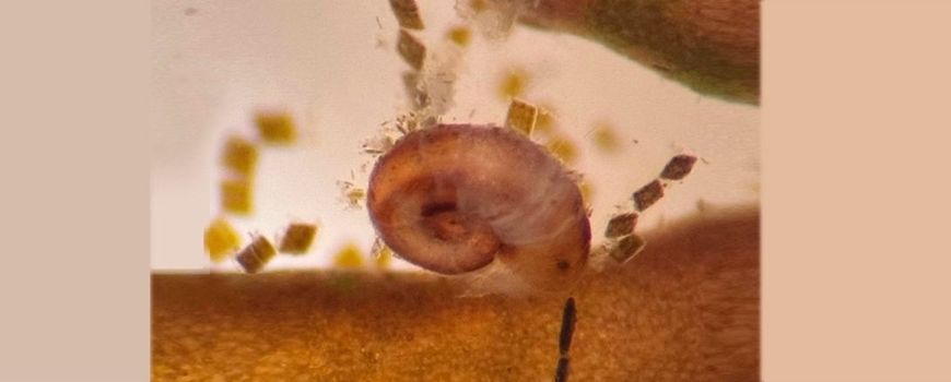 En zo viel haar oog op deze minuscule slak. Het dier kroop over een van de ronde assen van het Osmundea-wier. De sterke gelijkenis met de bekende Posthorenslak uit het zoetwatermilieu was treffend, al gaat het wel om een héél kleine uitvoering daarvan: de diameter van het niet volgroeide huisje was 0,53 millimeter. Hoewel de soort Skeneopsis planorbis al heel lang geleden uitgestorven is op de plaats waar nu ons land ligt, was het herkennen en op naam brengen niet moeilijk. De foto's van aangespoelde fossiele huisjes in een veldgids waren duidelijk genoeg. Nathalie's vondst is het eerste autochtoon levende exemplaar van onze kust. Ze kon er een aantal foto's van maken.