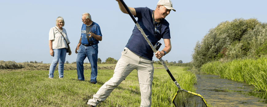 Voor de foto haalt Sietze zijn schepnet door een sloot in het buitengebied van Vianen. Samen met Berry en Emma bekijkt hij de inhoud: “Kijk, een kleine watersalamander. Dat deze soort hier voorkomt is gelukkig een goed teken.”