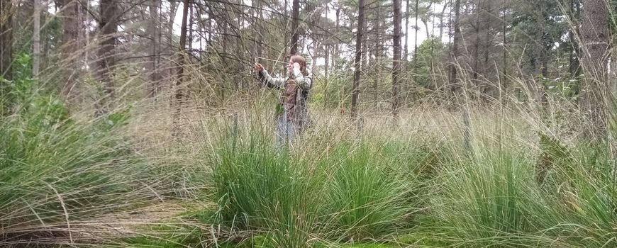 Lena Lichtenberg: “We zetten de dendrometer in om te beoordelen hoe dicht het bos is. Zo kijken we niet alleen naar het aantal bomen. Met een dendrometer meet je het grondvlak van een bos, dat is de som van de oppervlakte van de stamdoorsnede van alle bomen. Dit zegt ook iets over hoeveel licht er nog is. Belangrijk om te weten voor beheerders en eigenaren die willen dunnen of toekomstbomen willen vrijstellen.”