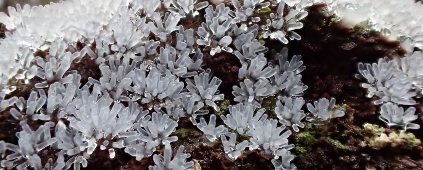 Nature TodayHet gewoon ijsvingertje, of ijspegeltje, is geen echte paddenstoel, maar een slijmzwam. Het groeit op rottend hout van zowel loof- als naaldbomen. De vele kleine, vaak bijna doorzichtige knotsjes worden vaak nog geen millimeter lang. Met een loep kan je de ‘vingertjes’ goed zien. Het is heel teer spul. Slijmzwammen zijn bijzondere wezens. Er zijn vele honderden verschillende soorten. Het algemene kenmerk van slijmzwammen is dat het een klont eencelligen is, die bacteriën eet. Dat klinkt dus echt niet als een paddenstoel. Je zou het van een klont niet verwachten, maar een slijmzwam kan zich zelfs een beetje verplaatsen! Vergelijkbaar met zwammen maken slijmzwammen ook sporen aan om zich voort te planten. De sporen van ijsvingertjes worden aan de uiteinden van de stekeltjes gevormd. IJsvingertjes gedijen in vochtig en koel weer en kunnen, in die weersomstandigheden, het hele jaar door worden gevonden.