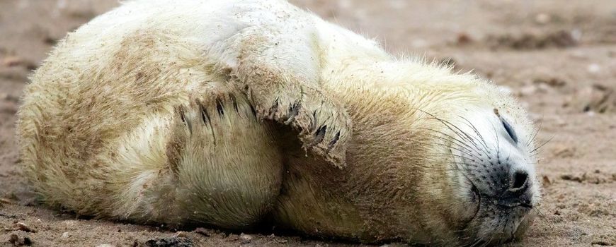 Nature TodayGrijze zeehondenpups hebben de eerste drie weken na hun geboorte een witte, wollige vacht, die wel warm, maar niet waterdicht is. Als de vette melk op is, hun moeders weer de zee op zijn gegaan en de kleintjes op land zijn achtergebleven, wordt hun langharige vacht verruild voor het grijze jeugdkleed. Tot die tijd kunnen ze niet gaan zwemmen om te jagen. Geen wonder dus, dat de pups in die weken flink afvallen. Ook zwemles krijgen ze niet, dat zoeken ze allemaal zelf uit. Als ze honger krijgen, gaan ze vanzelf de zee in. Ze kunnen meteen al een beetje duiken en hun adem inhouden, maar vis vangen? Vet moeilijk. Gelukkig komt dat vanzelf goed. Kun je je voorstellen dat je alleen, zonder instructies, het onbekende in moet duiken? Als volwassen grijze zeehond zijn ze volleerd: dan gaan ze routineus ruim honderd meter de donkere diepte in.