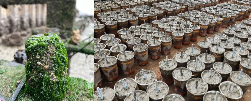 Beeld: NIOZ (leadfoto: links: Xiriton met begroeiing. Rechts: Xiriton-blokjes gemaakt met koffiebekers als mal)